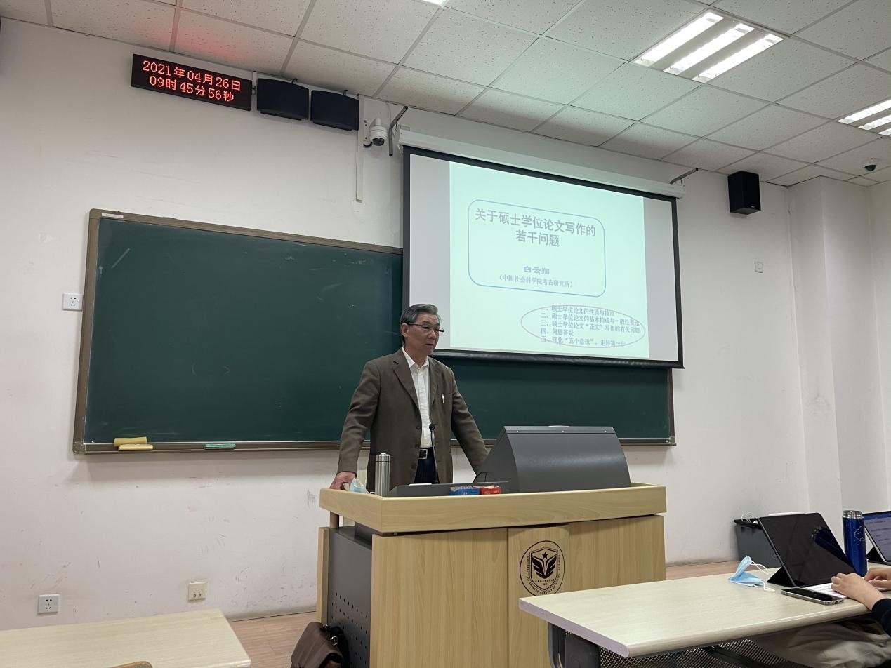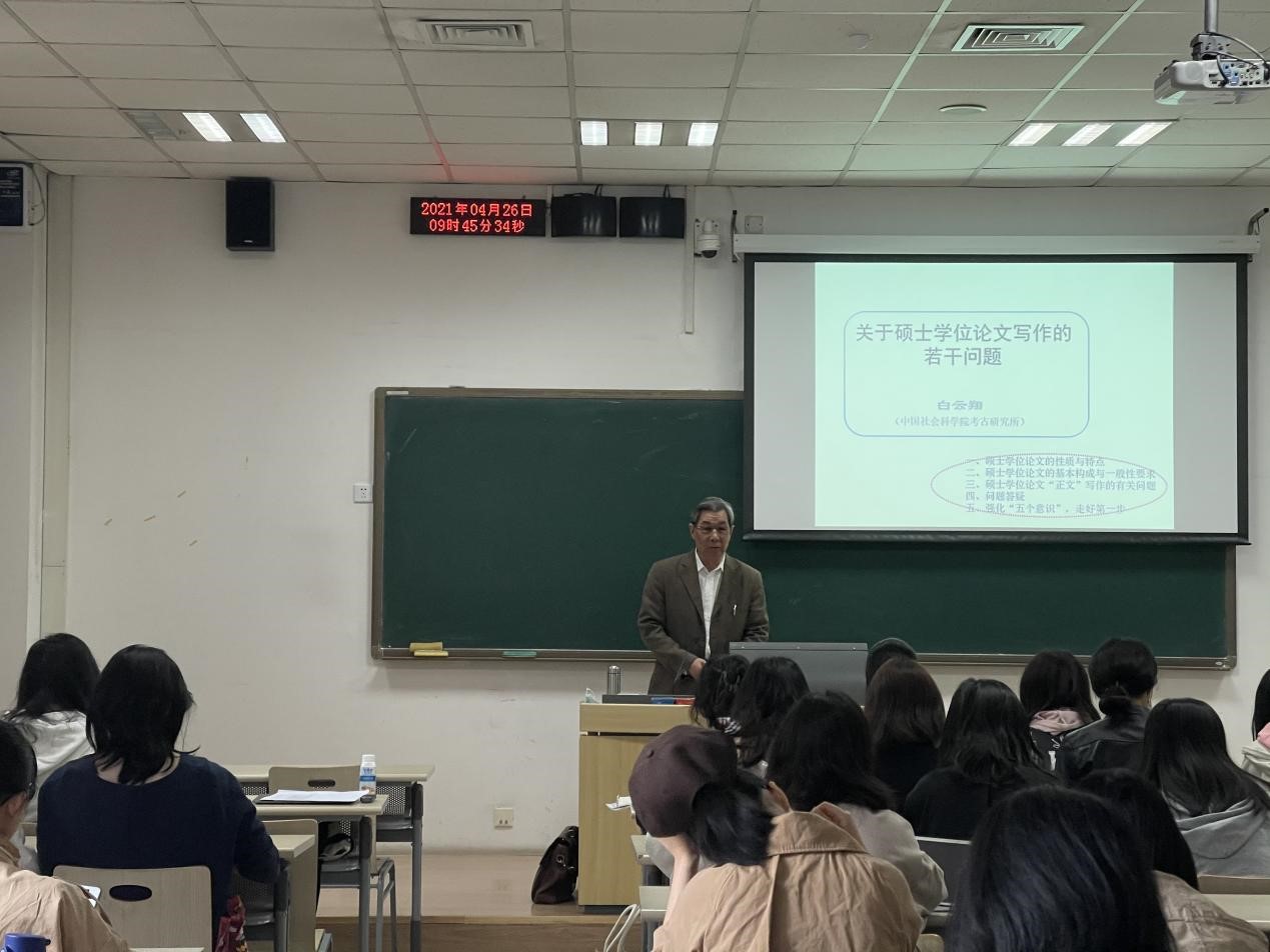 登峰战略学者、考古研究所原副所长白云翔研究员应邀在我校研教楼120教室为2020级文博专硕作了一场关于硕士论文写作的若干问题的专题讲座。