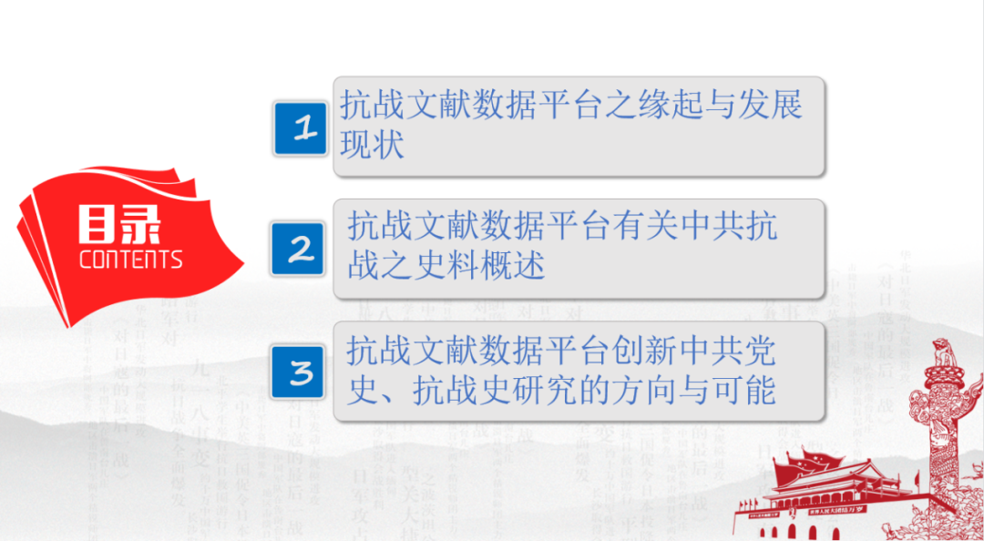 罗敏老师的讲座围绕“抗战文献数据平台”,从“抗战数据平台之缘起和发展现状”、“抗战文献数据平台中有关中共抗战之史料概述”以及“抗战文献数据平台创新中共党史和抗战史研究的方向和可能”三个部分进行展开。